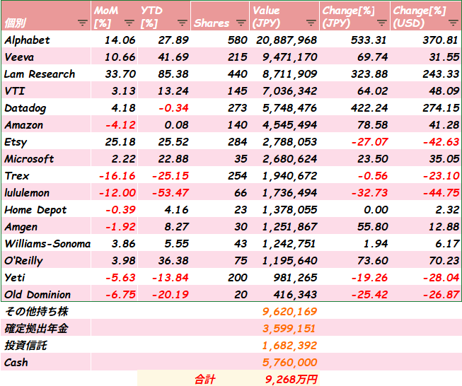 - ペーパーアセットの評価額は9,268万円(前月比 +7.9%, YTD +9.1%)