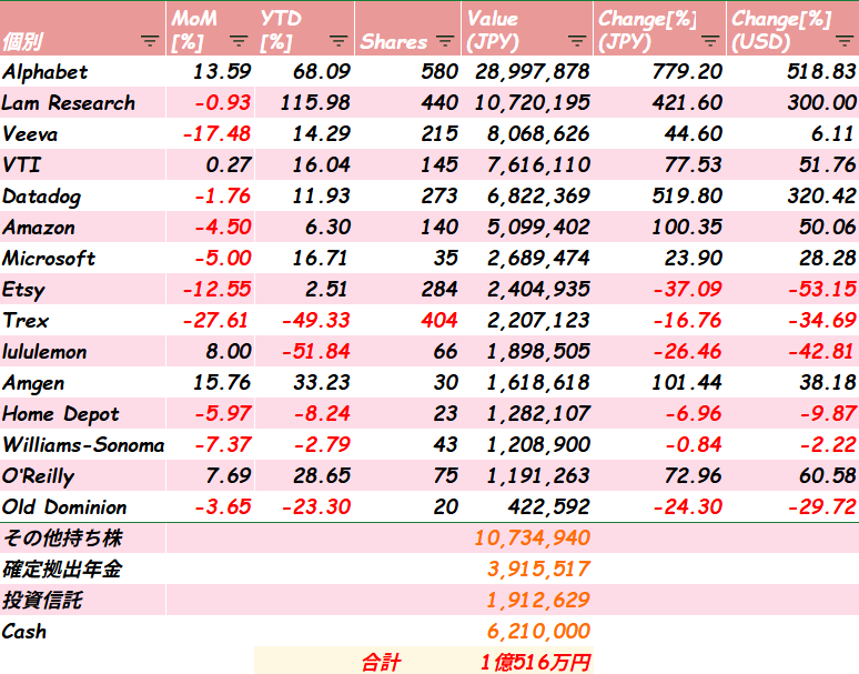 - ペーパーアセットの評価額は1億516万円(前月比 +2.5%, YTD +23.8%)